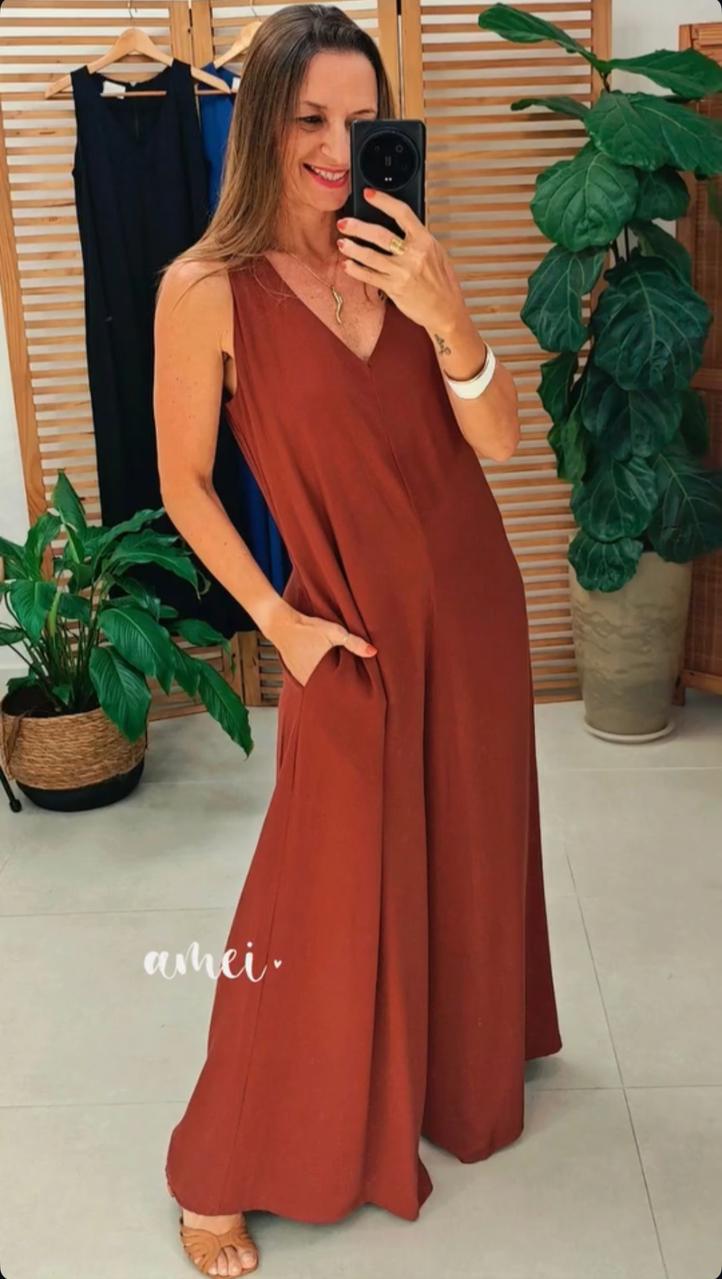 Macacão em viscose, decote v, com bolso, leve e confortável.