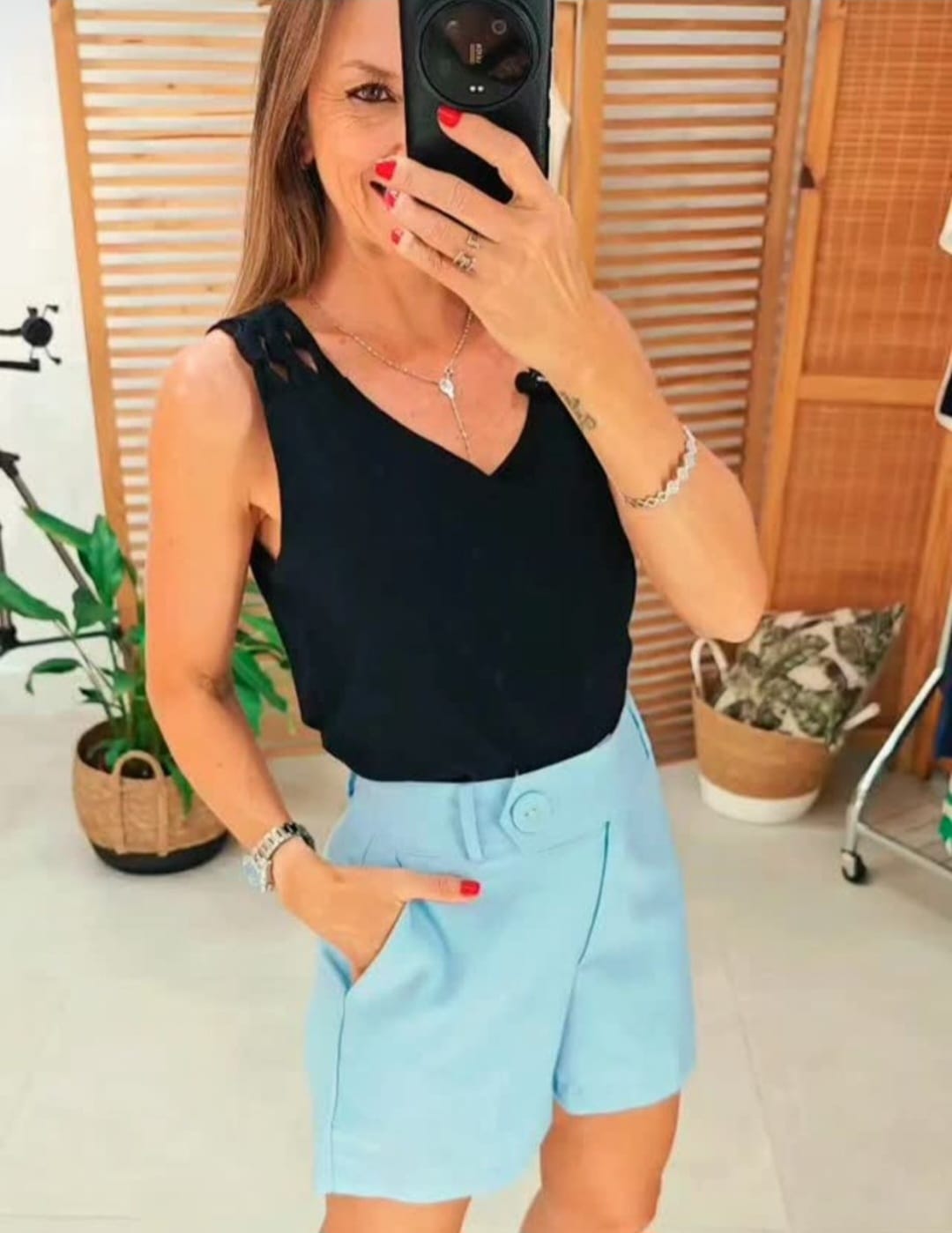 Regata forrada em viscolinho com elastano, detalhe em trança na frente.